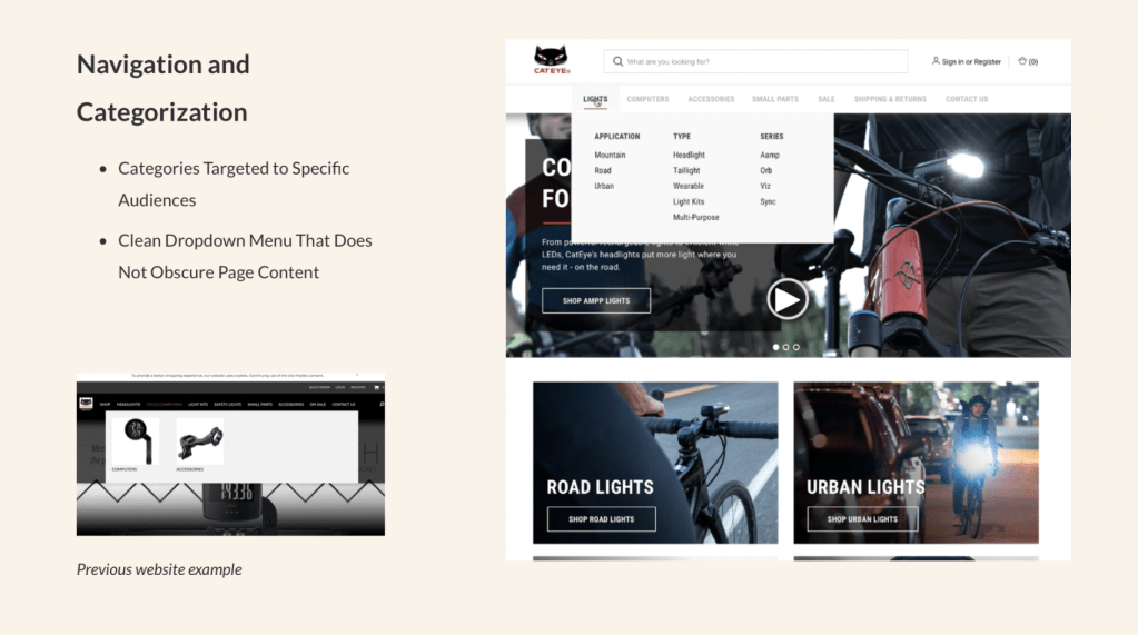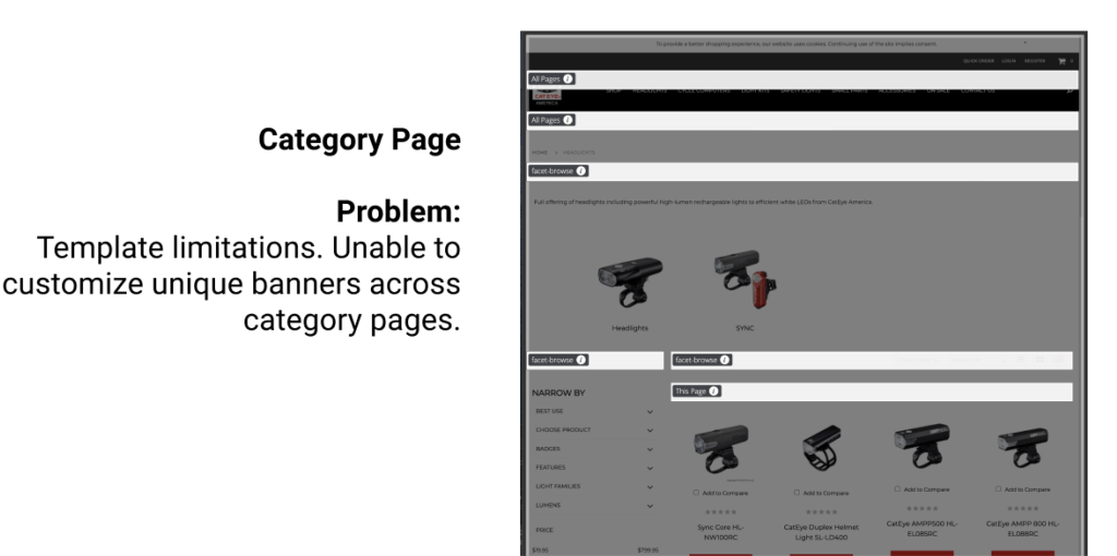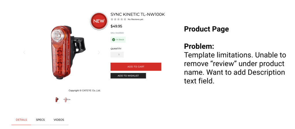 Cateye America experienced a rapid drop in visits and sales. Based on direct customer feedback provided by the Cateye Technical Support team, we found that potential customers were leaving the site because of confusion over product details and site navigation.