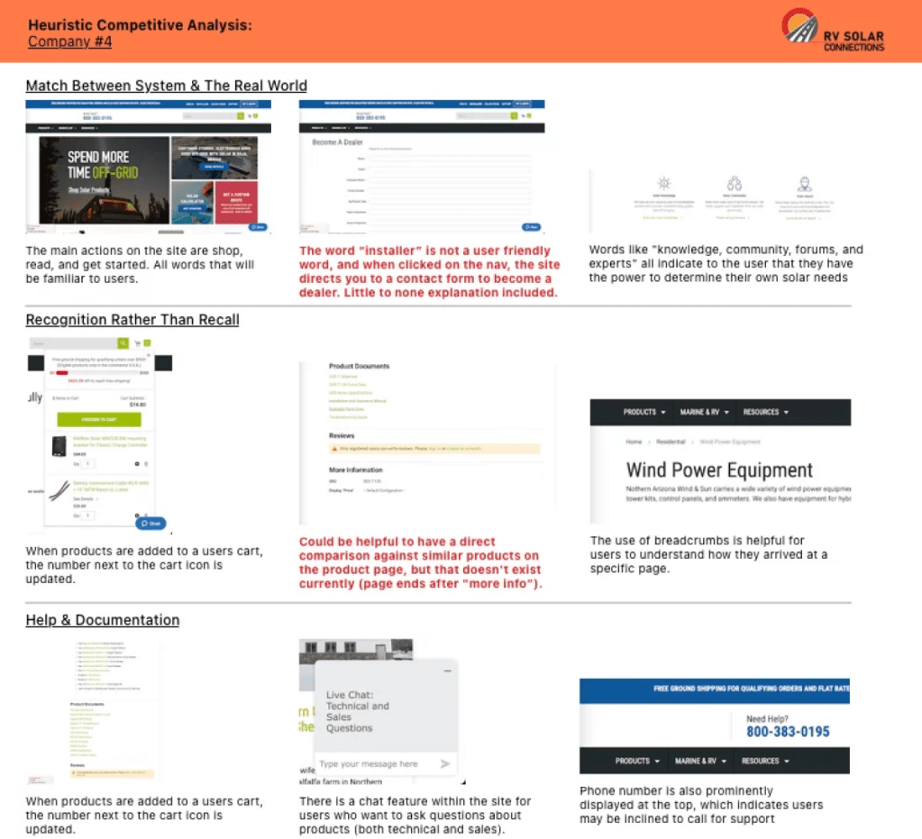 In order to understand the problem a little more, we set out to better understand what competitors were doing. This was accomplished through a heuristic analysis and general research done on 6 different competitor sites. We used 3 of the 10 relevant Nielsen’s Design Heuristics and followed up with a thorough analysis of how the client’s site also compared to the research gained from the other sites.