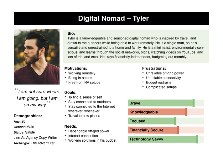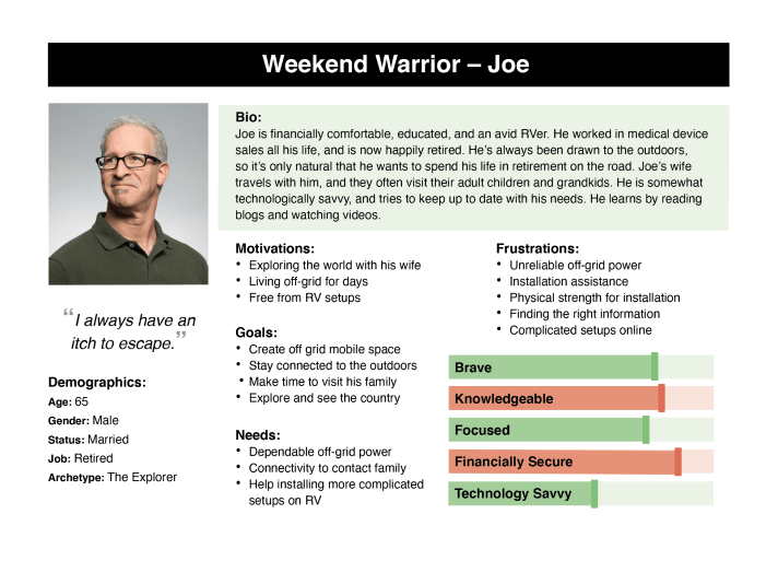 After reviewing this new information with the client, the group decided that the most important way to spend our time on persona development was to focus only on the users who already know what they want and have some knowledge of their solar needs. Although the client understands that these people only account for around 20% of the user base, he also sees the opportunities for streamlined sales with these users that require the least amount of his time for consulting and educating. These two personas helped the group relate to an actual user’s needs, wants, and thought processes, and would be at the forefront of our design decisions moving forward.