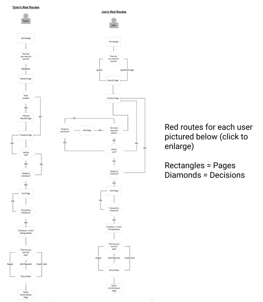 We used the data and insights from the 2 user journeys to create red routes, which helped us and our client visualize the exact decisions both personas would be making as they navigated the site. The red routes for each user represents their most critical path, which in this scenario, is the path to purchase.