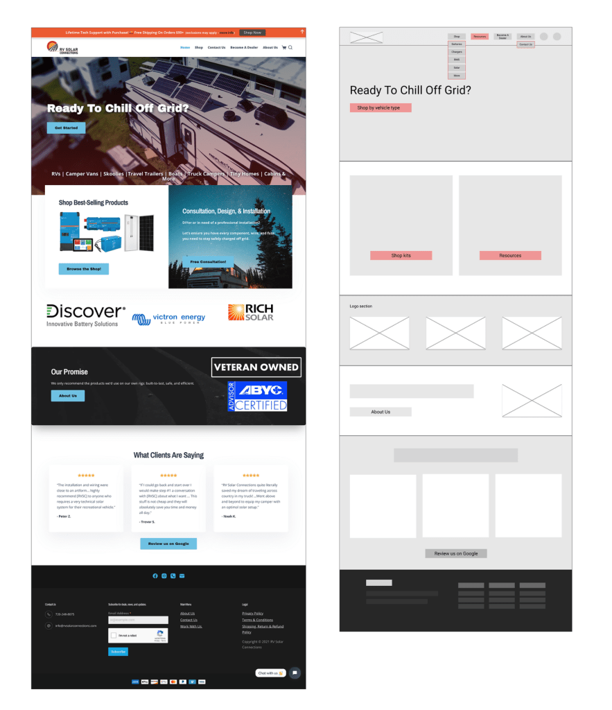 RV Solar Connections is a small business with a national reach, but the team of two does not have time to commit to a full website redesign. Our team worked with RVSC toward the goal to identify a MVP list of enhancements that could help them achieve immediate growth and increase conversions.