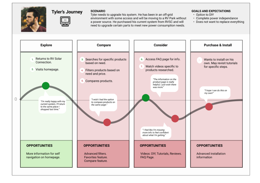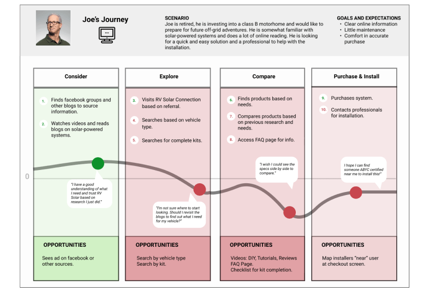 Using discovery and UX research methods, our team identified opportunities that RV Solar Connections could achieve growth through key enhancements to their website while avoiding a complete website redesign.