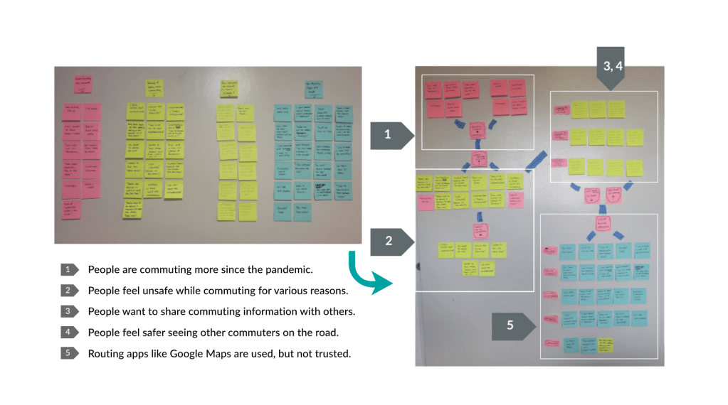I used an affinity map to download the most important findings and quickly found patterns emerge that helped me further define my problem space.