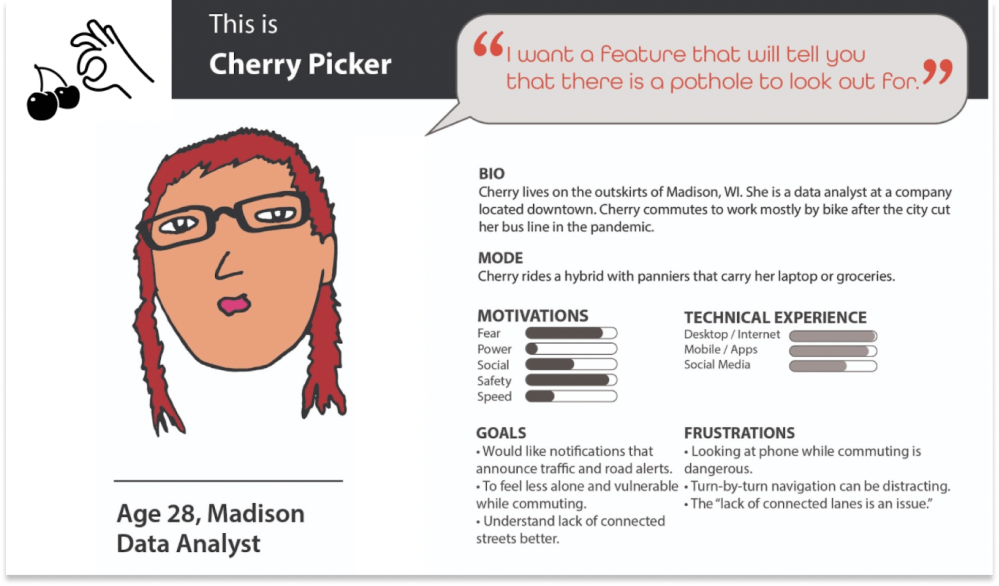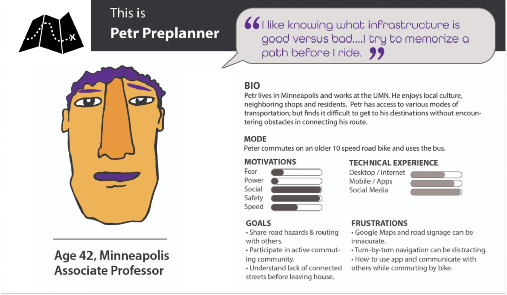 Personas allowed me to capture my collected interview data as identified needs, goals, pain points and see how a user might use a product to address their commuting frustrations.