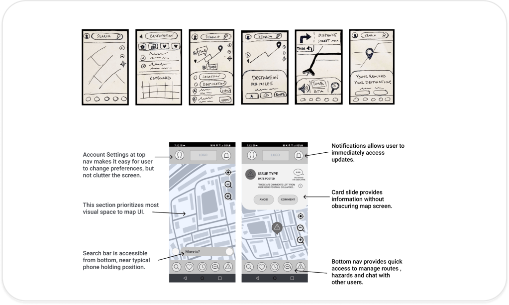 My sketches included both design flows modeled after Google Maps (for user familiarity) and that addressed user’s pain points.