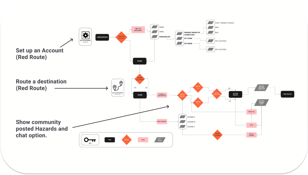 To help me capture my MVP, I constructed a user flow of what a basic start to finish journey looks like while routing a destination to see navigation through user goals. This was based around three interaction goals: app sign up, routing a destination and avoiding a hazard.