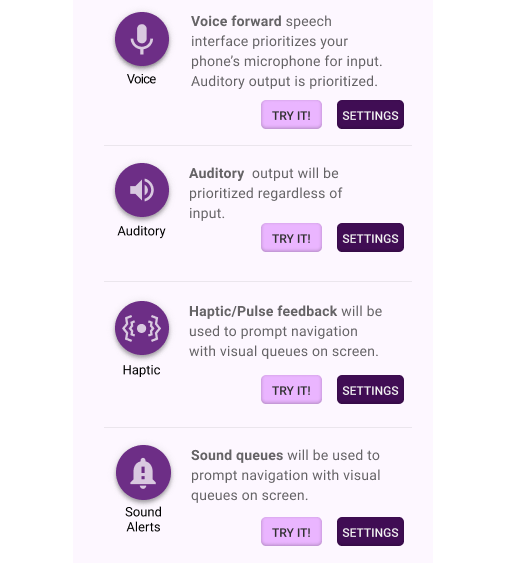 Action: setting control options are meant to customize to unique commuting needs, providing the option to feel or hear what each mode does before commuting.
